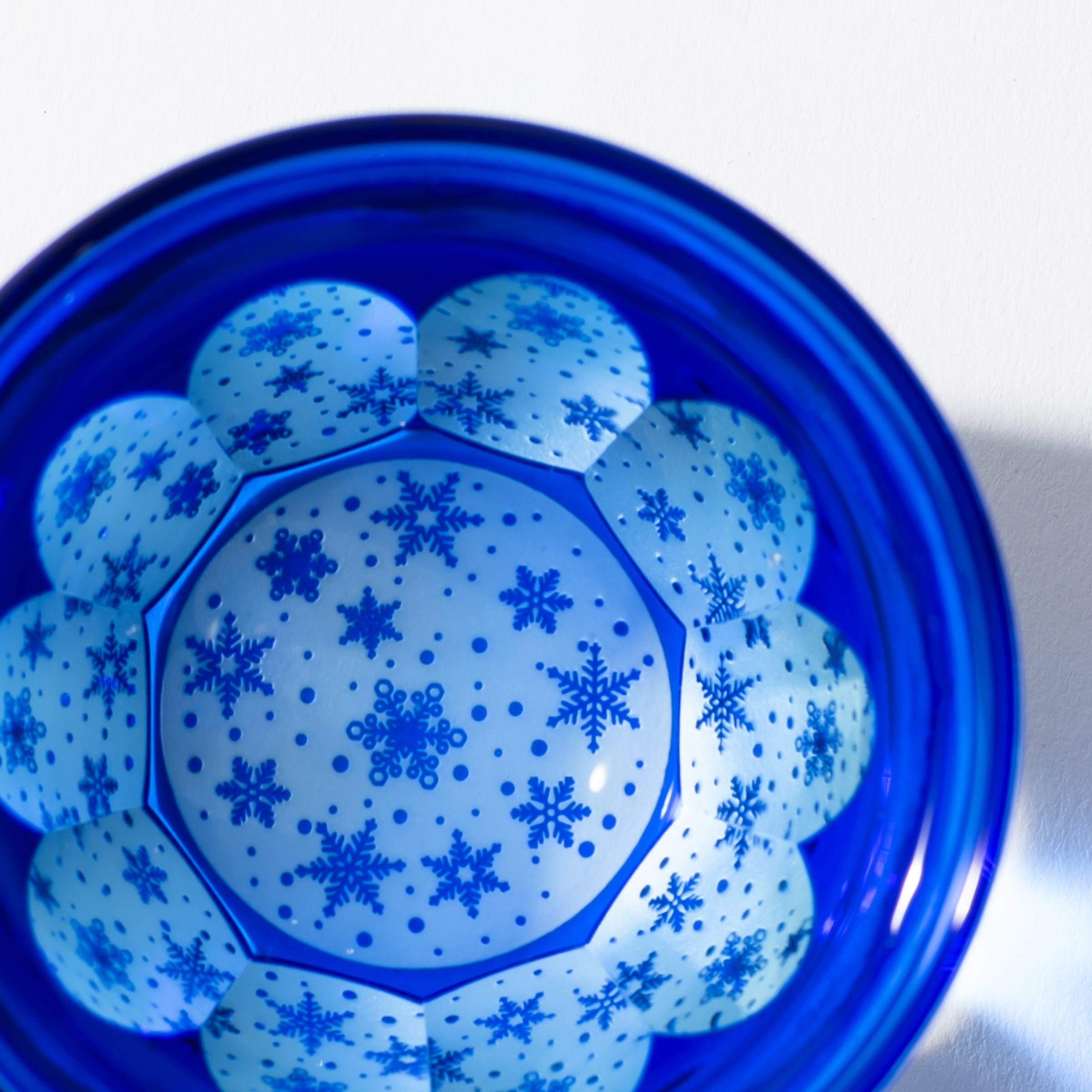 グラスにお酒を入れるとグラス底面に彫刻した模様が側面に映り込み雪の結晶が広がる、椎名切子ならではの不思議なグラスです!