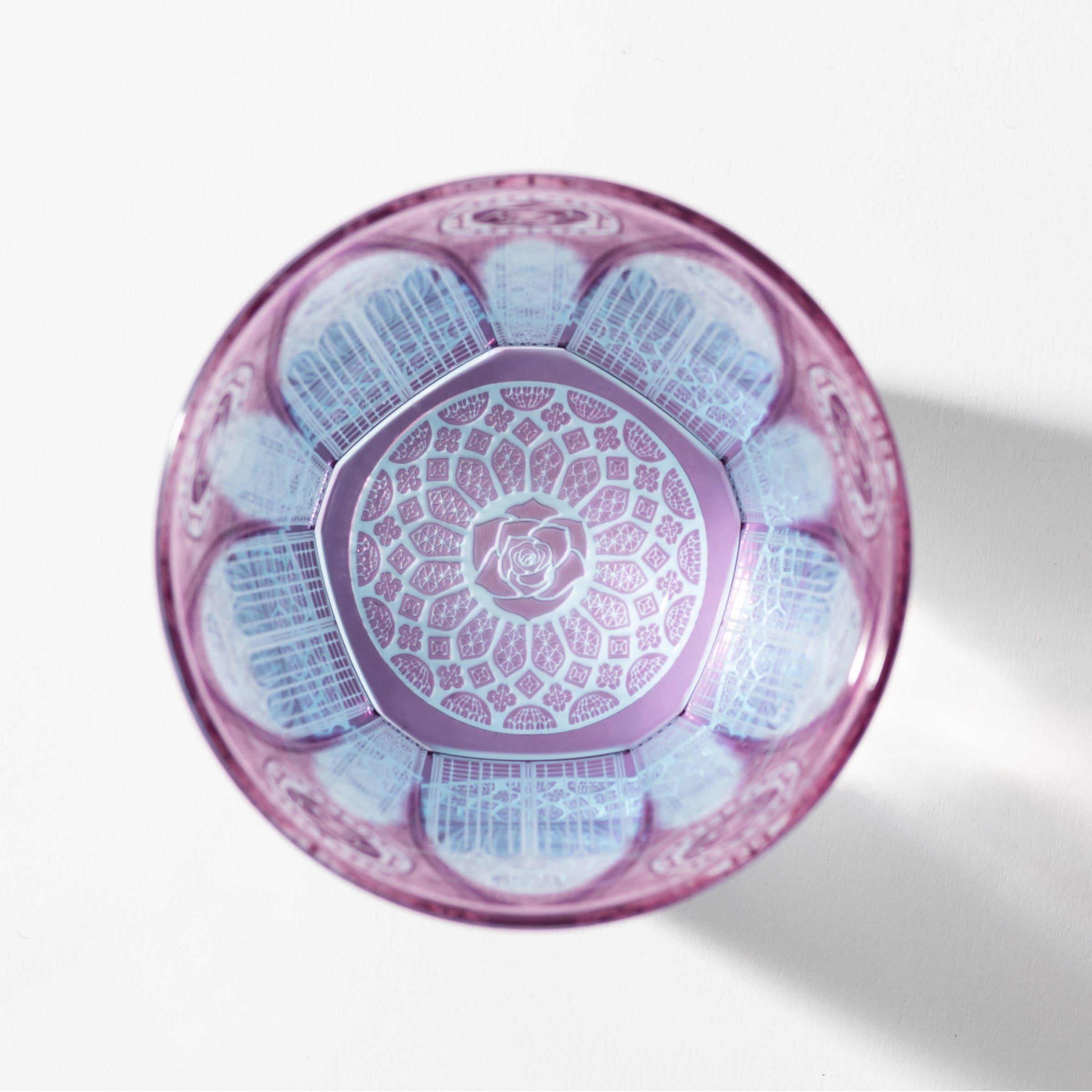 2020年、江戸切子新作展にて発表された異形の作品。記憶にも新しいパリ、ノートルダム寺院が火災。それにインスピレーションを受けたのがこちらの「赤薔薇の大聖堂」です。「手の中に大聖堂を」をコンセプトに平切子とサンドブラストを組み合わせ、見事に大聖堂を表現しました。