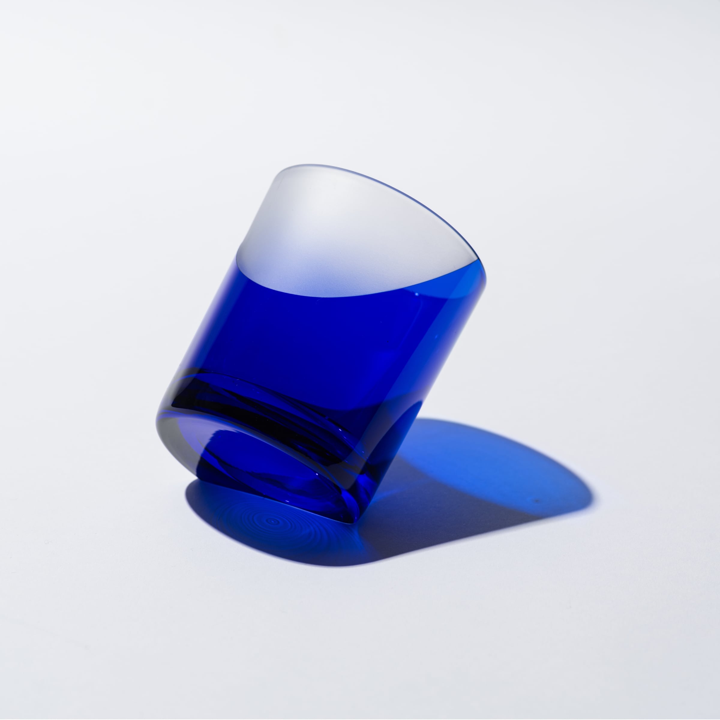 平切子でグラスを斜めに置ける加工を施し、サンドブラストで冠雪を表現しました。斜めに置く事で富士山を表現しています。実はこのグラス、ちゃんと縦置きも出来るので使う際は縦置き、飾る時は斜めに置き富士山としてみていただけます。