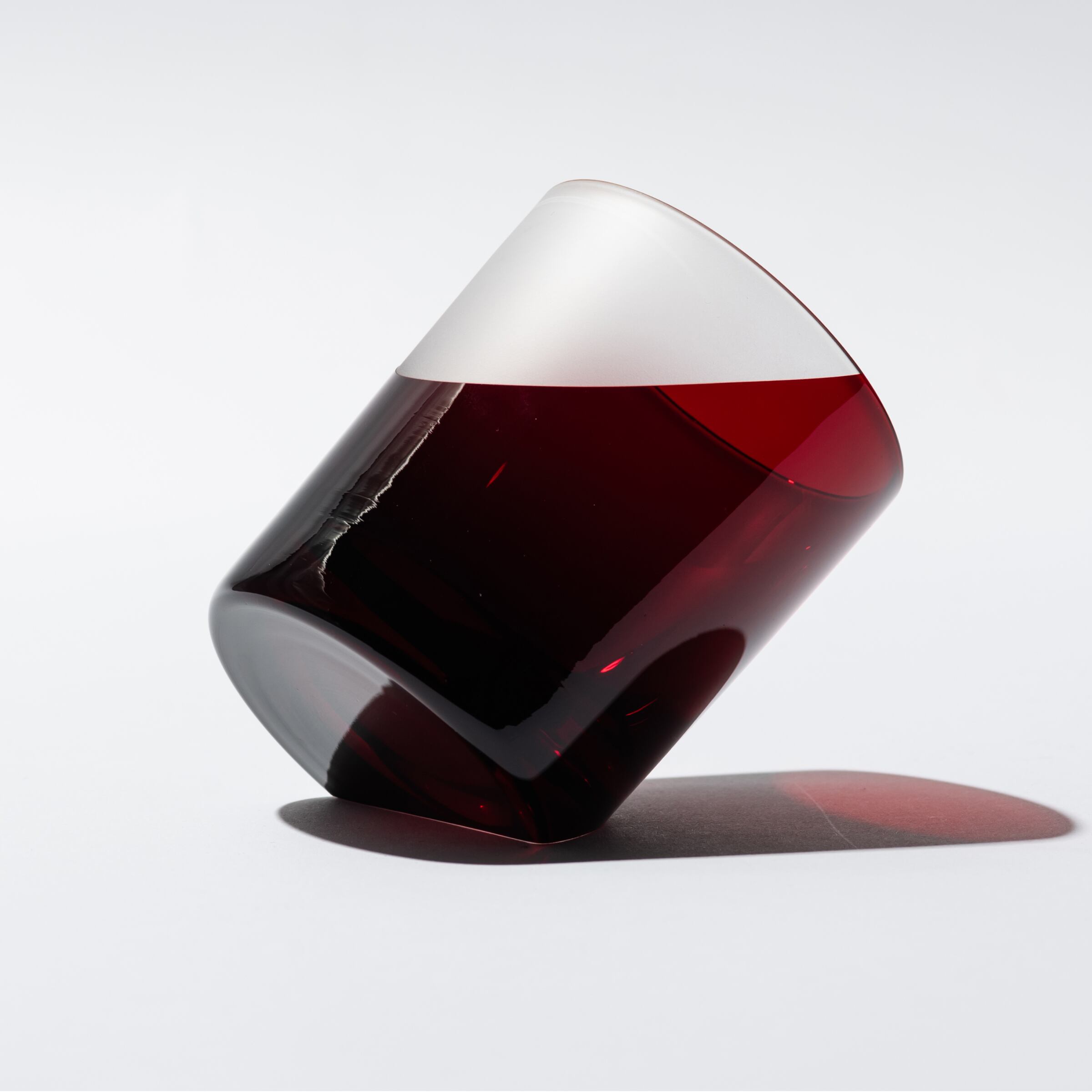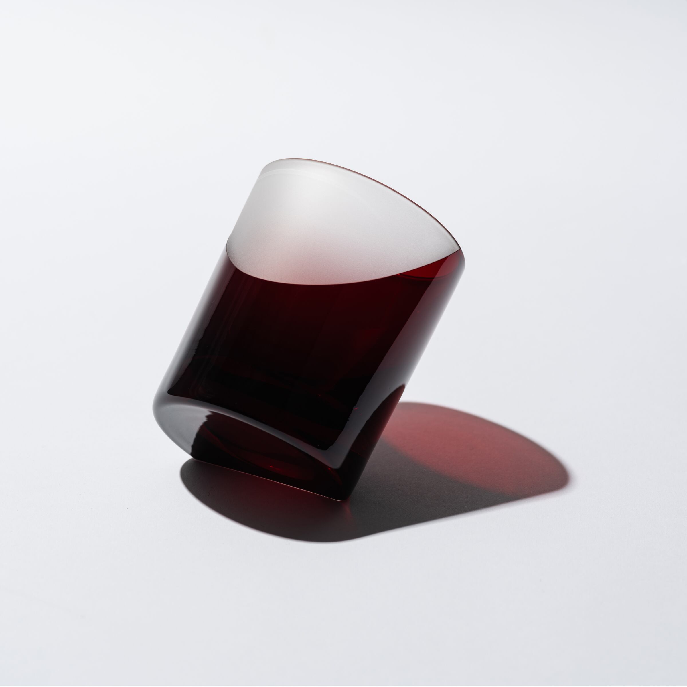 平切子でグラスを斜めに置ける加工を施し、サンドブラストで冠雪を表現しました。斜めに置く事で富士山を表現しています。実はこのグラス、ちゃんと縦置きも出来るので使う際は縦置き、飾る時は斜めに置き富士山としてみていただけます。
