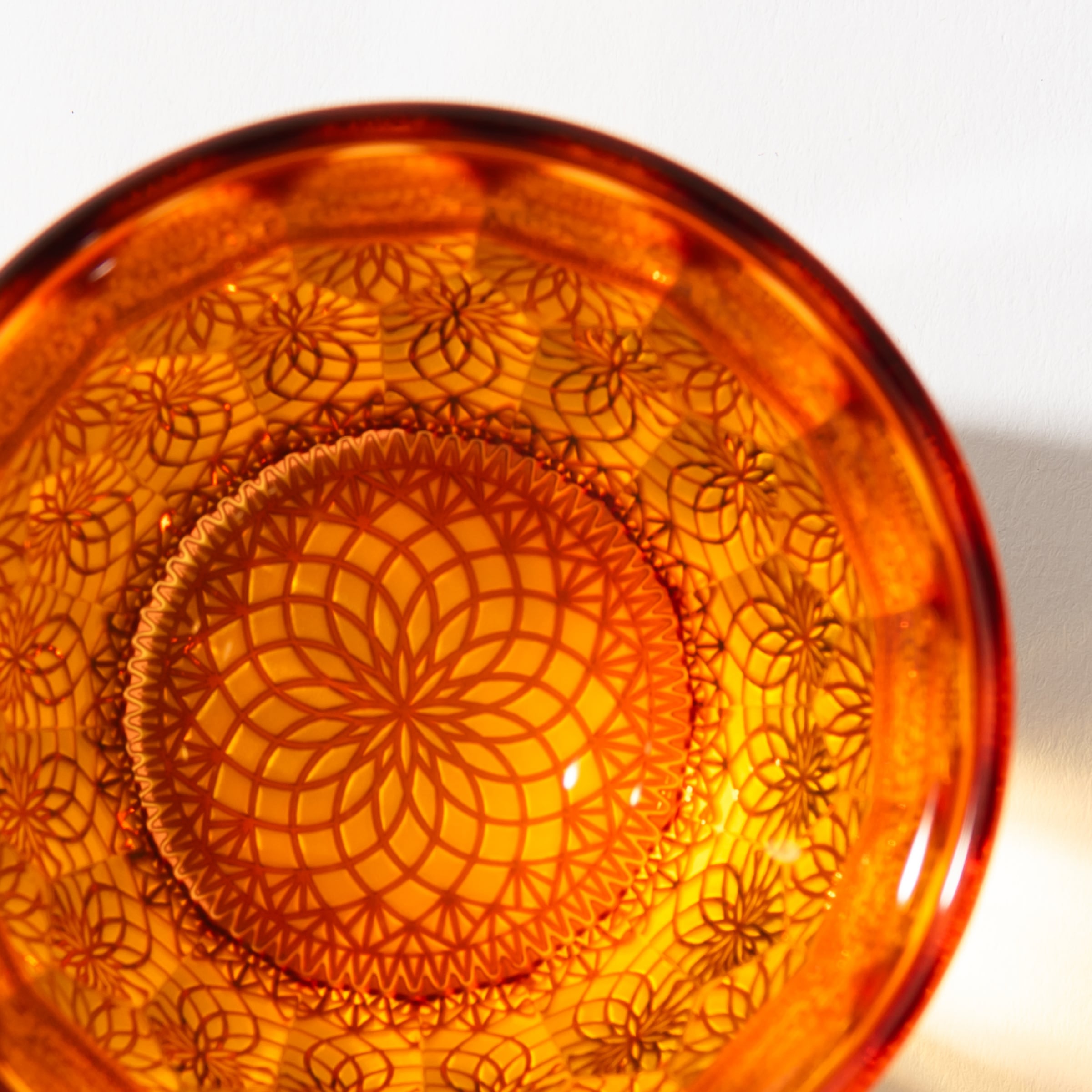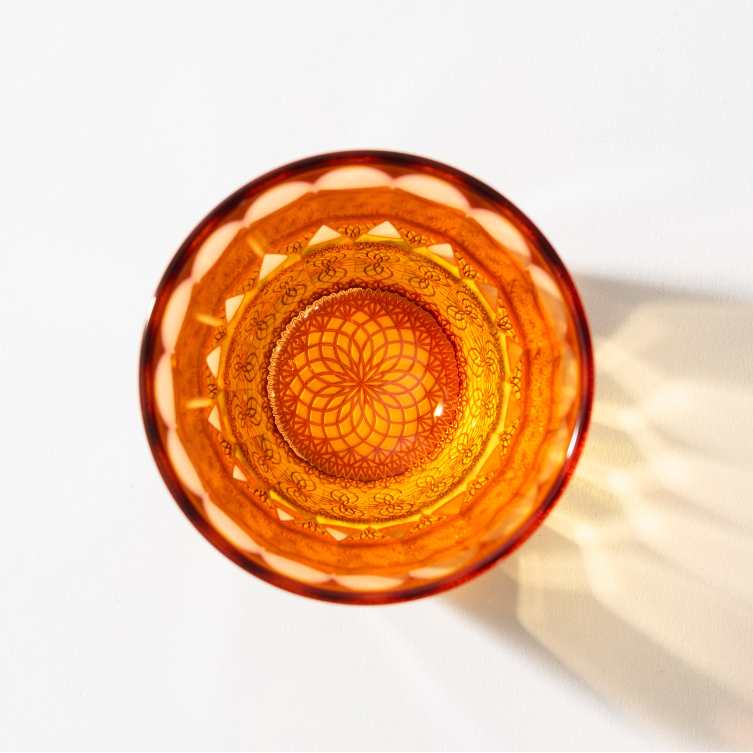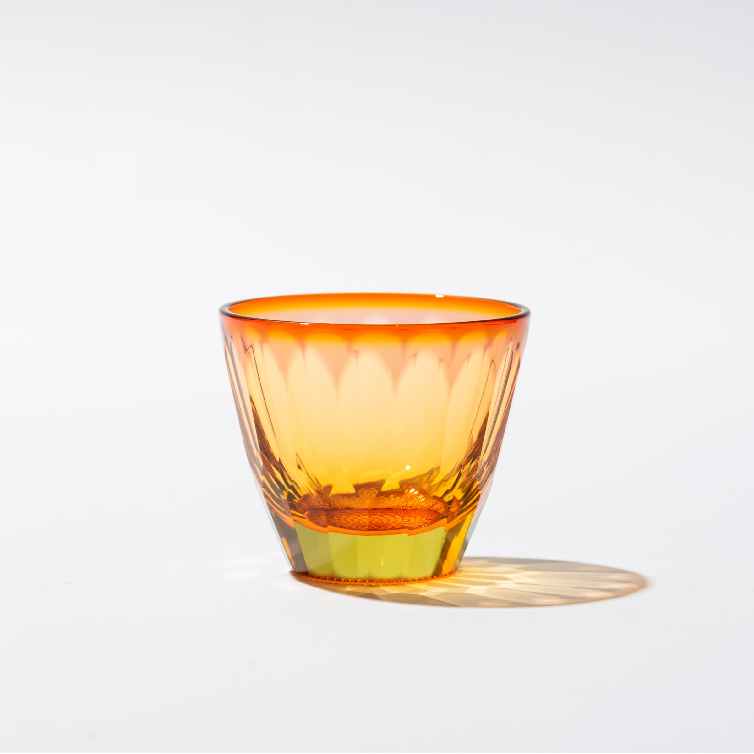 本作品はベースをオレンジ、被せに金赤(ピンク)を使用。側面は平切子にて2段階に研磨、底面に抽象化した向日葵を彫刻。側面に底の模様が映り、お酒やお水を入れることで初めて「完成」するという作品です。ご好評につき今回は夕日に照らされた夕焼けの向日葵をイメージして制作しました。
