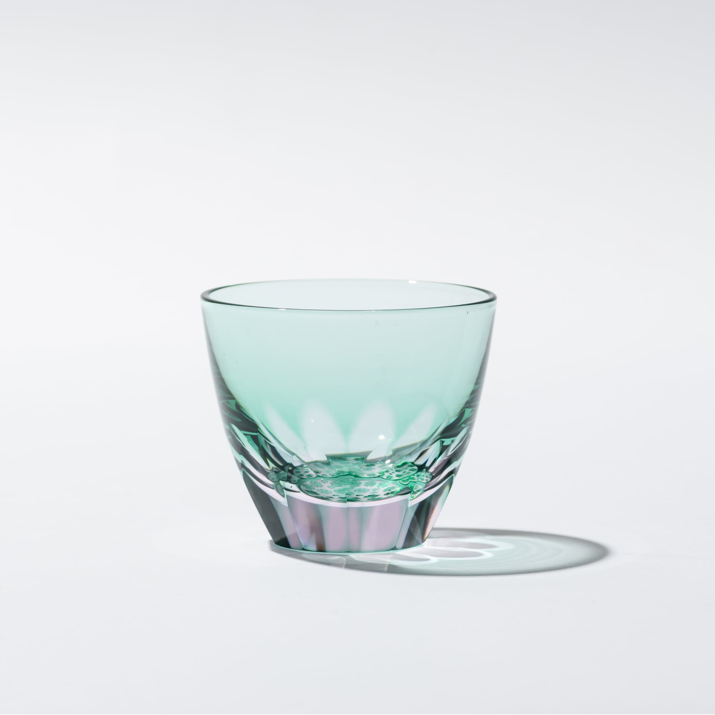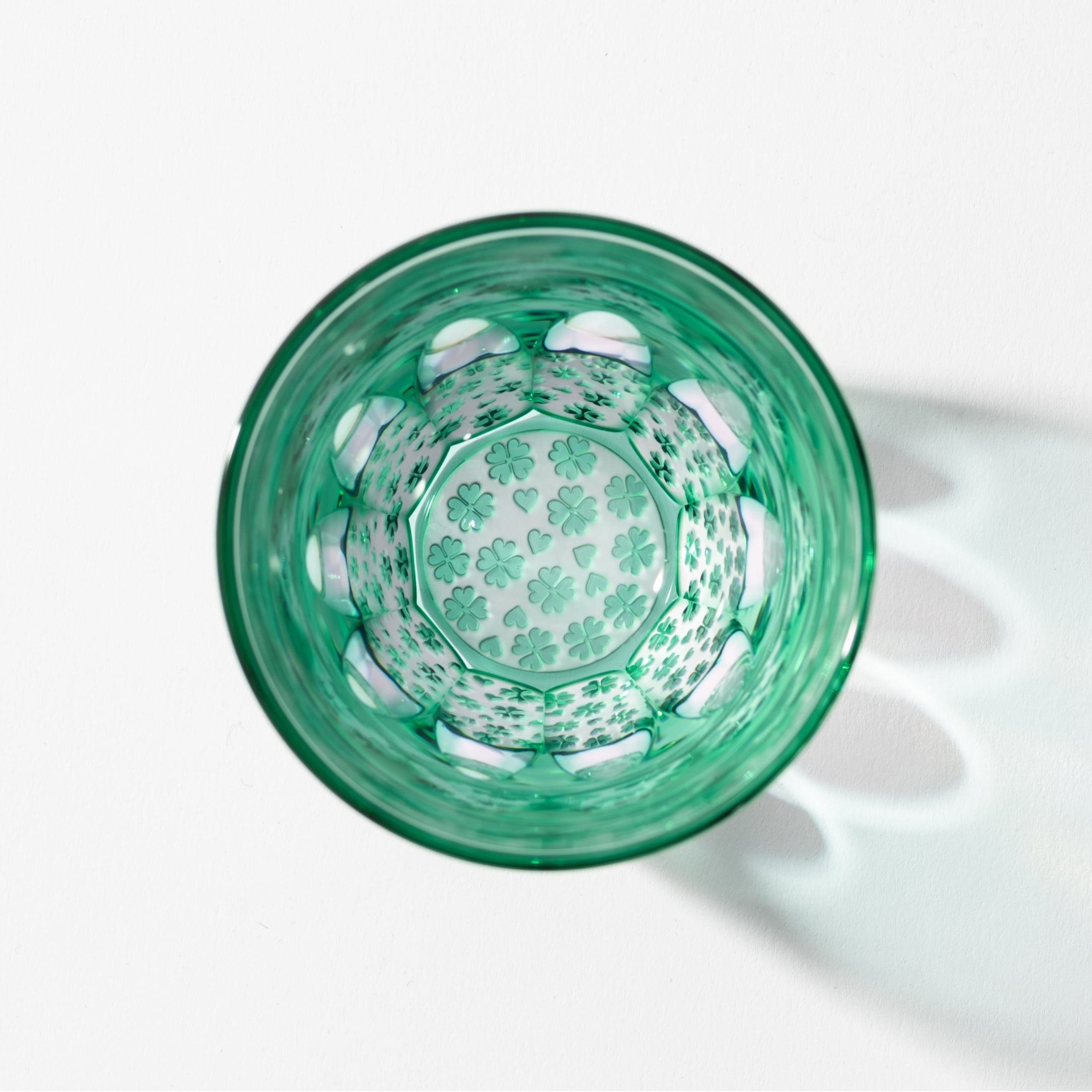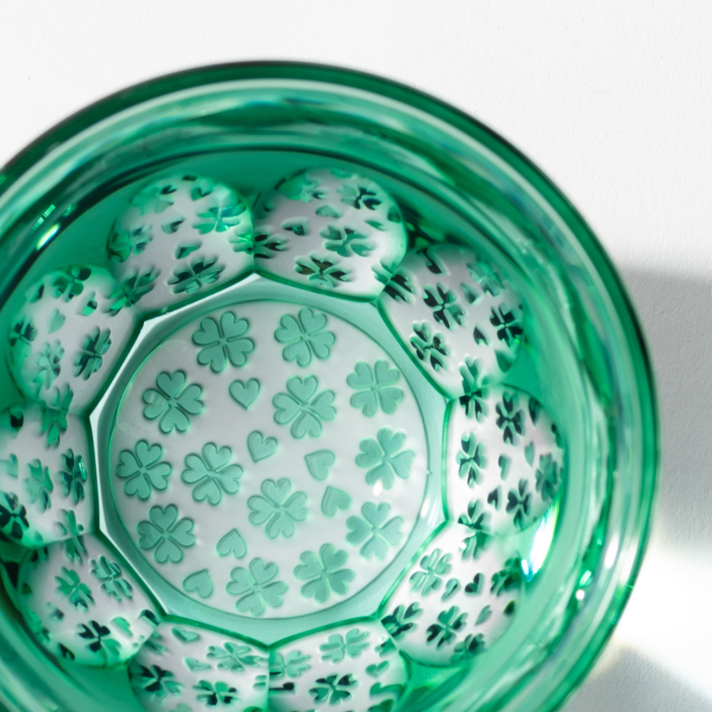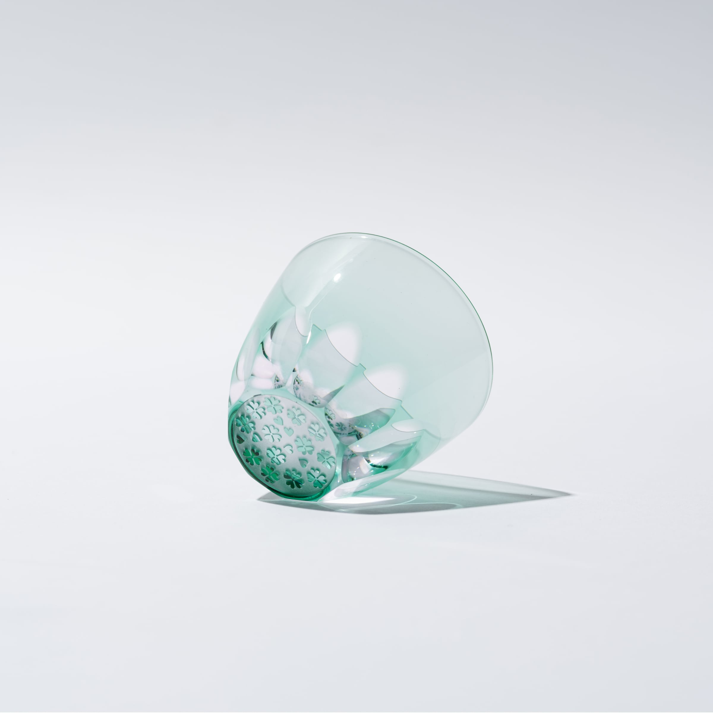 グラスにお酒を入れるとグラス底面に彫刻した模様が側面に映り込み桜の景色が広がる、椎名切子ならではの不思議なグラスです!ピンクの素地に緑を被せた2重構造の被せ硝子を使用し、四葉のクローバーが沢山咲く芝生を表現しています。江戸切子でよく使われる「色被せ硝子」の特注品を使用しています。