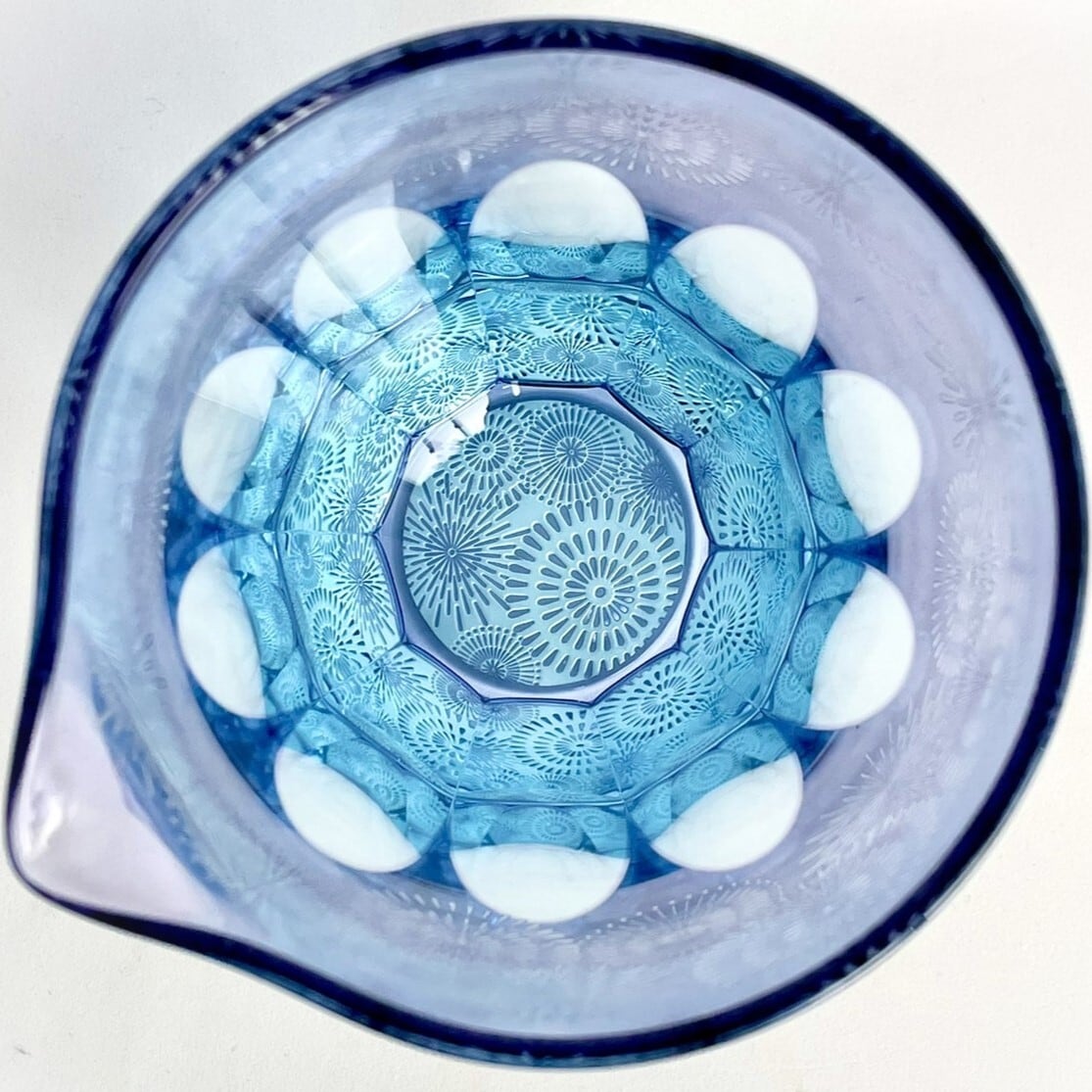 上部側面の模様は空に打ちあがる花火を、底の模様は隅田川の水面に映る花火をイメージしています。グラスにお酒を入れるとグラス底面に彫刻した模様が側面に映り込み空と水面の視界一面に広がる花火をお楽しみ頂けます。